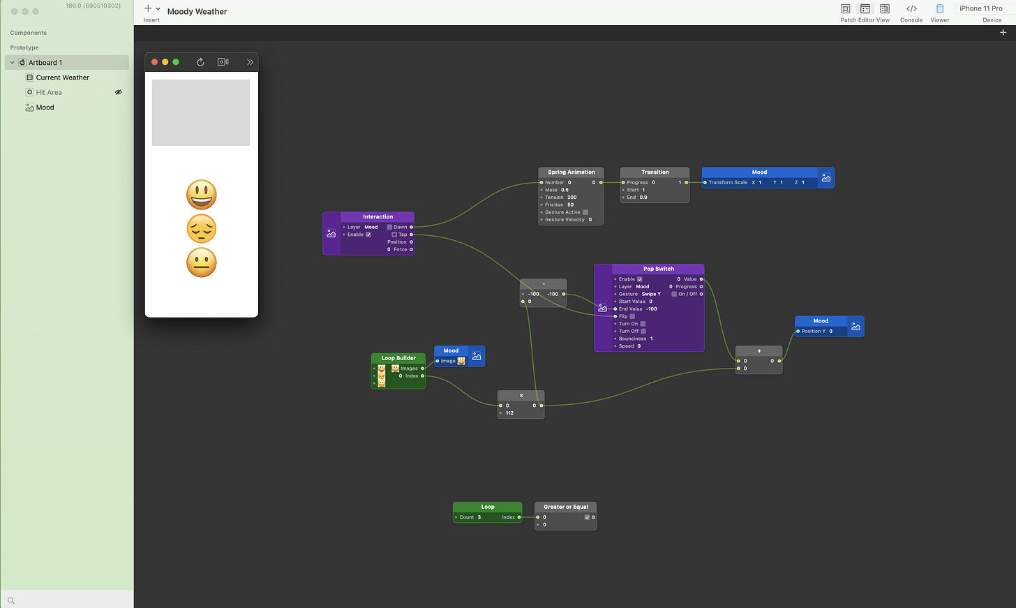 One of the major things I learned was about Components. All of the major elements - the weather icons, emoticon faces, and list items were ALL components, which is why I could control them individually and switch them out as needed, which was great when I wanted to change one of them and could have it automatically replaced along the entire program. Even though it’s always hard to look at your work and think it should be better, I am glad that I met my goals of building something that truly taught me a lot. I’m surprised by how much I liked building these digital experiences and how even really simple seeming interactions necessitate intentionality.