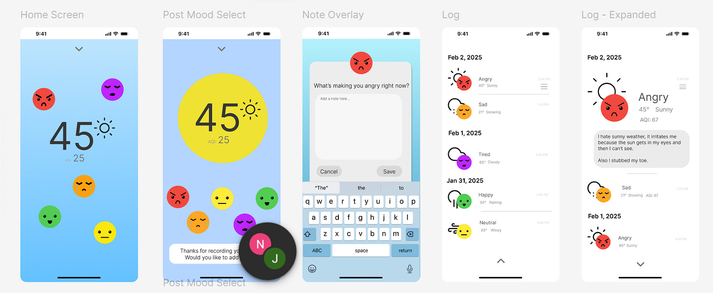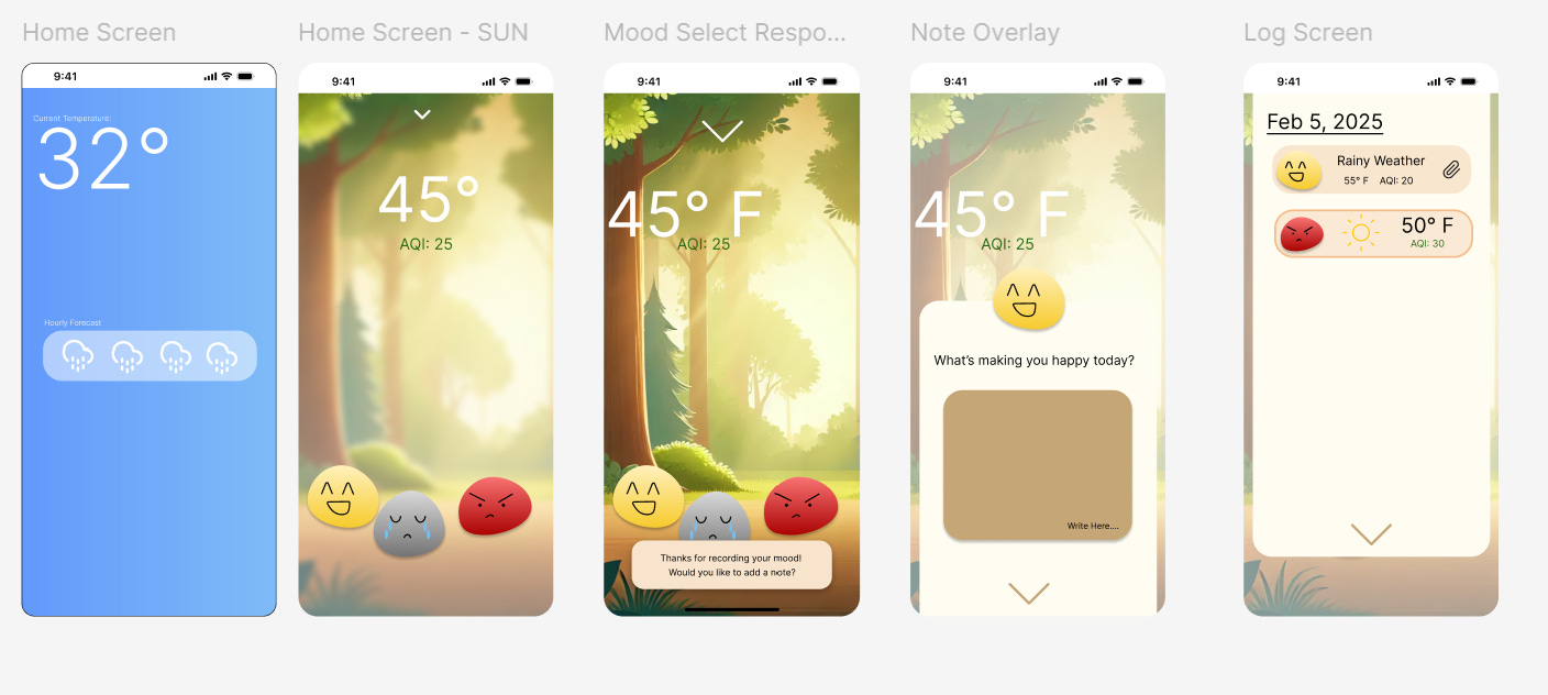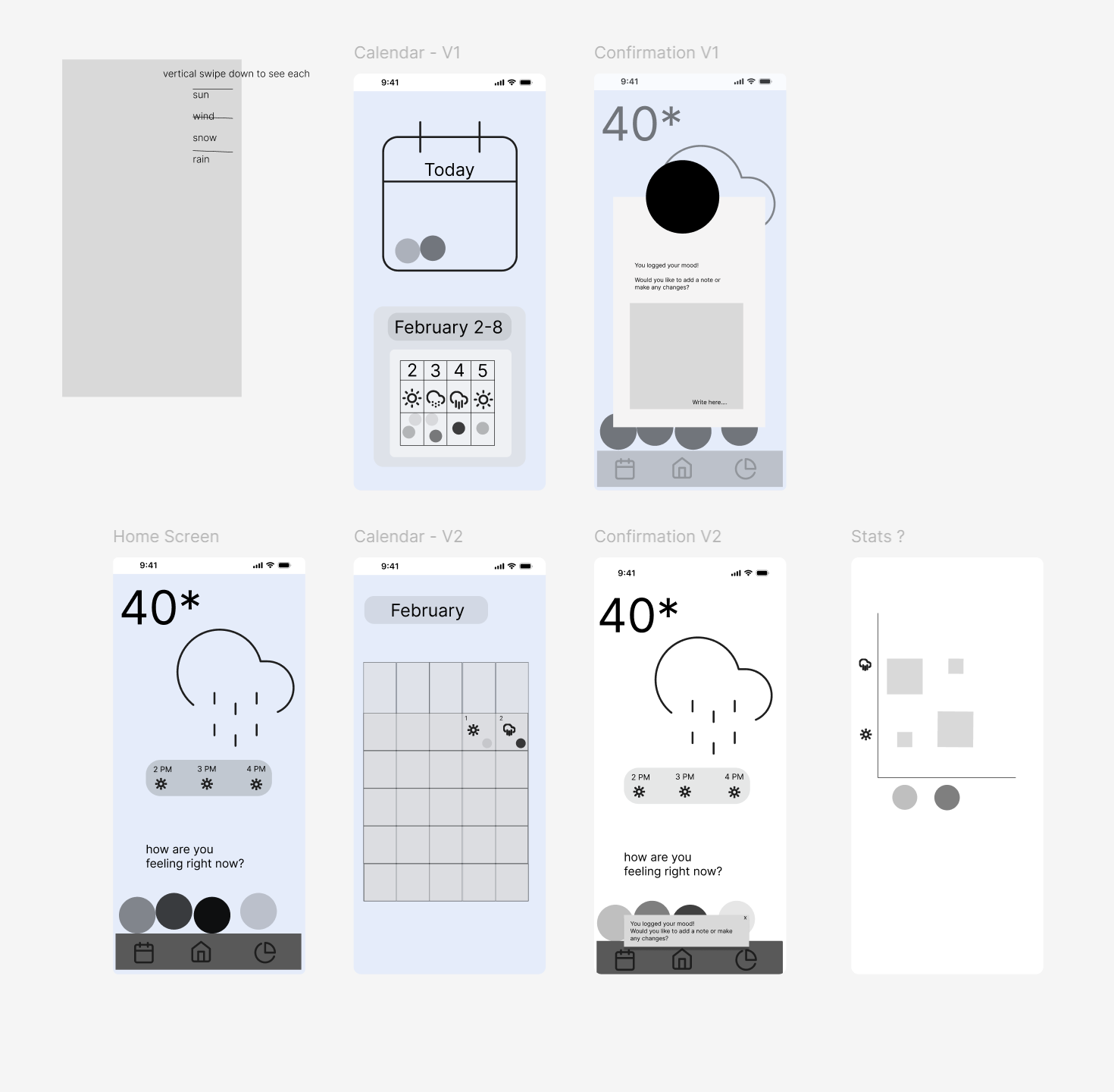 So when we were asked to come up with ideas for a weather app, I chose pretty quickly to incorporate a mood tracking app into the weather app. I check the weather pretty regularly, but I’ve never really been able to keep up with a habit/mood tracker because I never build the ritual of checking it, so instead of creating a new habit, I could just tack it onto the one I already have. I was hoping to learn some illustration, but this idea had a lot more logic to it, so I went with it.