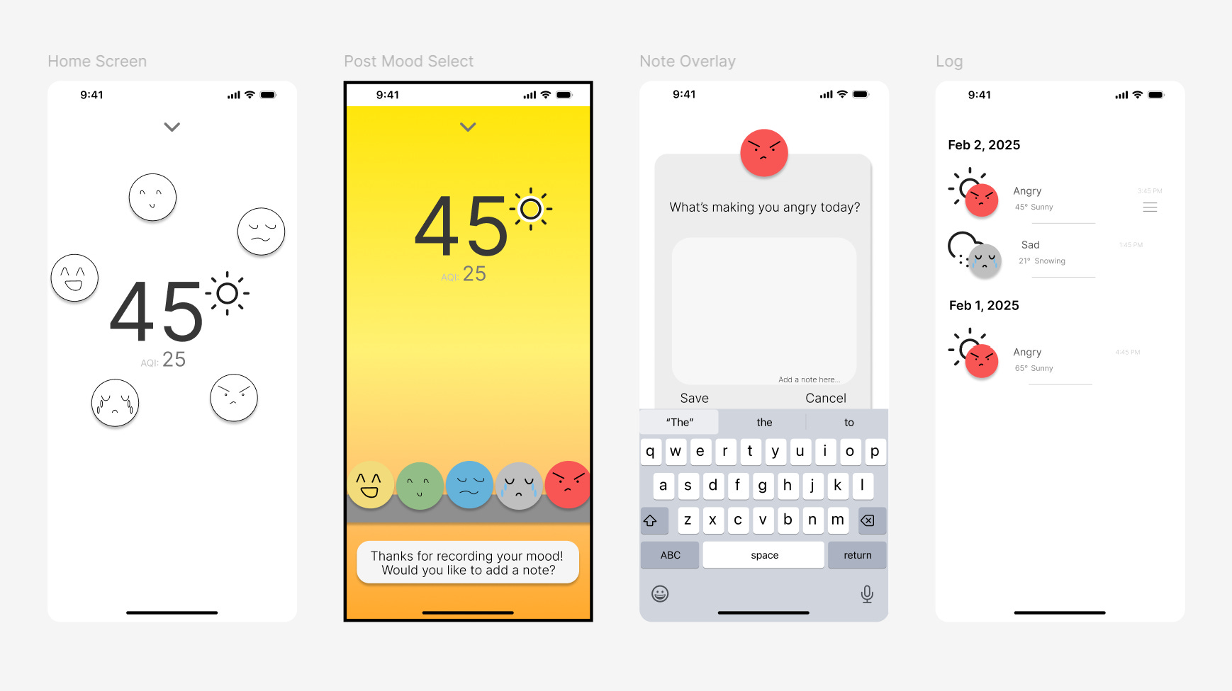 As I tried new emoticons, I still felt the colors and typography weren’t really working. The mood dudes really set the tone of the entire app, so they had to be exactly right. As much as I loved the gradients, the solid background was less distracting from them.