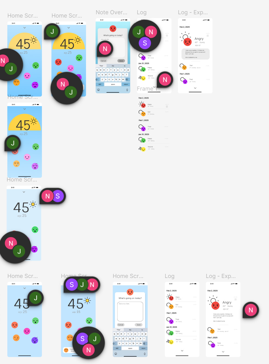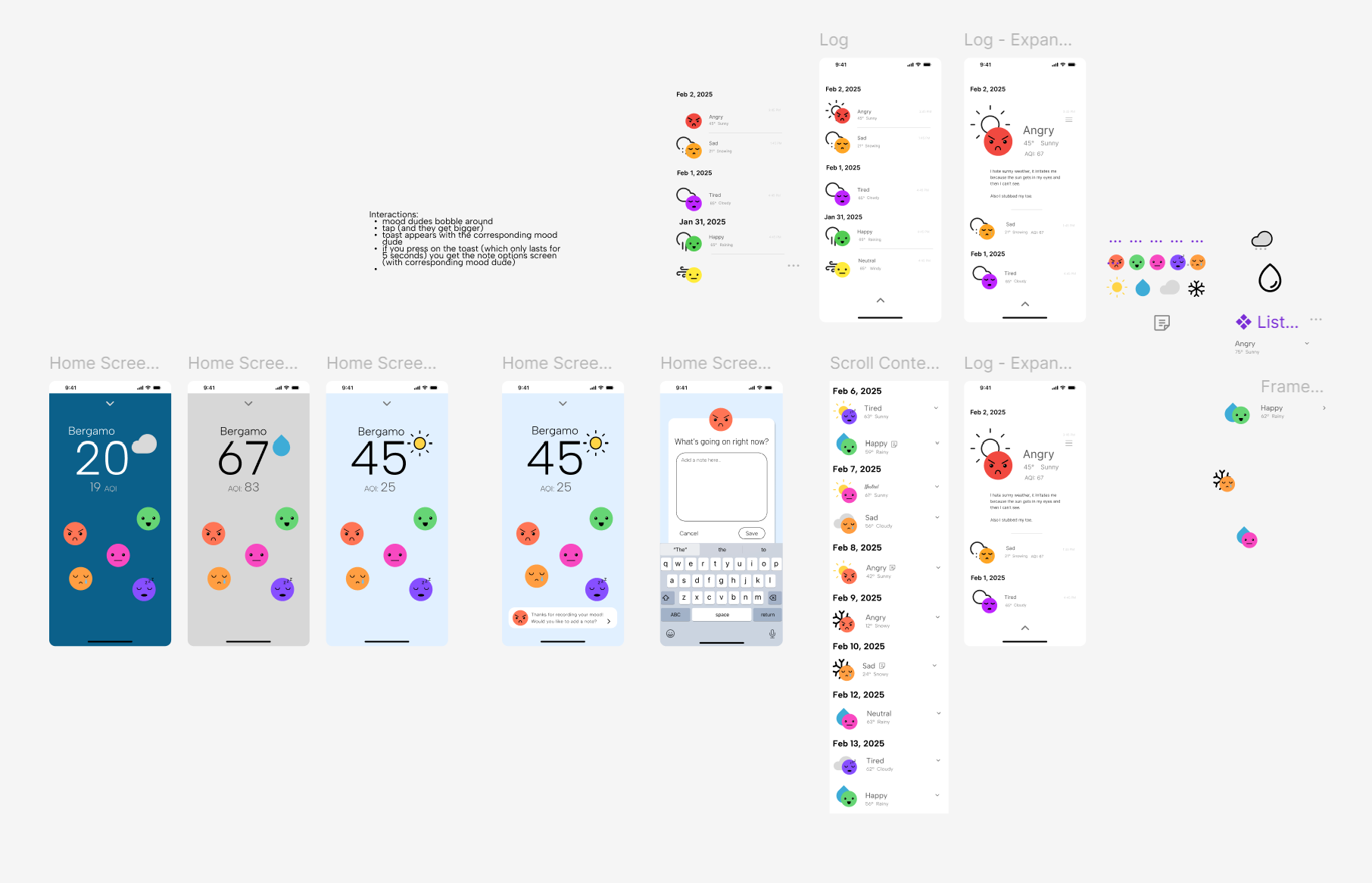 I played with having them float around, which people liked but would make them harder to tap, and I liked the way the list view worked, but the faces still felt underdeveloped, so I went online and looked at countless emojis before finding a few that I liked and redesigning them in Figma so I could utilize them.