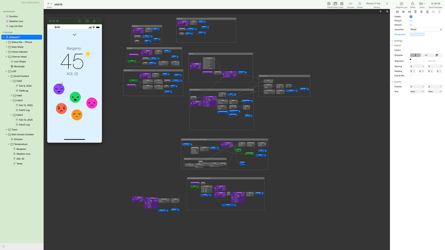 I wanted to lay out the interactions and start testing them out, even before I really jumped into Figma, so I started using Origami, the software we were learning for high end prototyping animations. Unfortunately, Meta has only made the software available for Mac, so I also had to learn how to use Apple products. Luckily, I was able to use one of the schools computers and had a giant screen to build in, and I used my iPad to test the prototypes out.